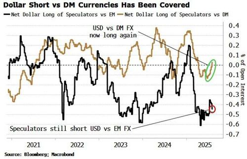 While there is a still a net short position in the dollar overall, the short versus developed-market currencies such as the euro and sterling has been covered, and positioning is now net long again. Speculators are still net short the dollar versus emerging-market currencies (and that’s getting shorter), but when it comes to the DXY, it is only developed currencies that matter (mainly the euro).