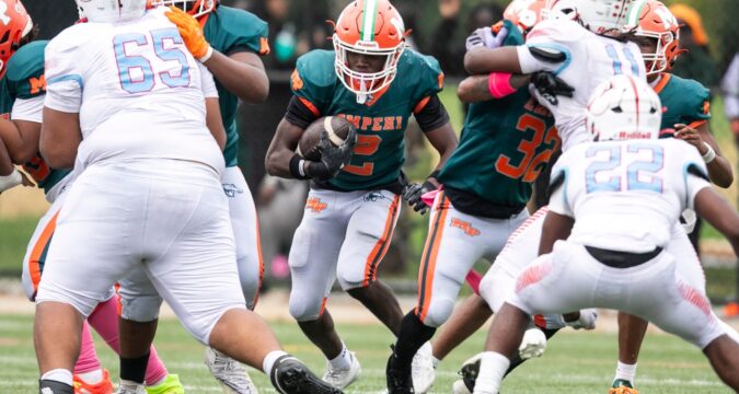 Morgan Park’s Reggie Gray Jr. (2) sprints down the field for a big gain against Kenwood during a Public League Metro game at Gately Stadium in Chicago on Saturday, Oct. 18, 2025. (Vincent D. Johnson / Daily Southtown)