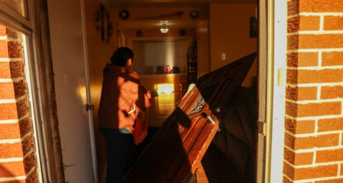 Joe Botello steps through a patio door shattered by federal agents when they broke down the front and back doors of his home in the 900 block of Chippewa Drive in the early morning on Sept. 16, 2025, in Elgin. Botello said the federal agents did not show residents in the home a warrant, placed him in a vehicle, but eventually released him after scanning his driver’s license. (Stacey Wescott/Chicago Tribune)