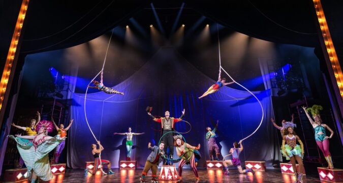 The production is visually triumphant, choreography brightened by airborne acrobatics, balancing acts and terpsichorean tricks. The score, though admittedly not particularly memorable, does have a some toe-tappers, with music flowing something akin to a concept album. Imagine Cirque du Soleil … set to folk music.