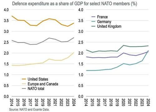 Regarding global military expenditures, Goldman analyst Germaine Khong told clients that the figure topped $2.6 trillion in 2024, accounting for 2.4% of GDP – up from 2.2% in 2021-22, with much of the increase coming from European and Asian countries.