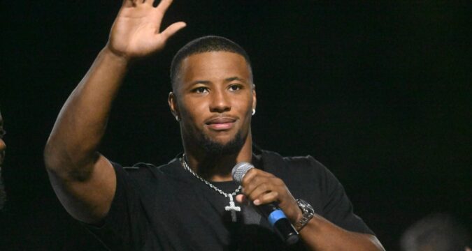 Saquon Barkley is inducted into the Whitehall Hall of Fame on Friday, Sept. 5,2025, at halftime during a Whitehall High School football game in Whitehall Township. (Amy Shortell/The Morning Call)