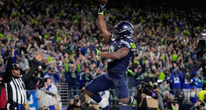 Walker’s three rushing touchdowns tied him with Shaun Alexander for the most in a playoff game in franchise history. Two of the scores came after halftime, and he celebrated one by chucking the ball into the crowd.