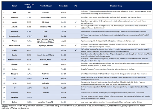 The list of companies below is part of the desk’s M&A monitor, which shows “potential M&A situations reported through the press” and also “highlighted in blue are those with news updates since our last note.” A list of failed M&A approaches was also recorded.
