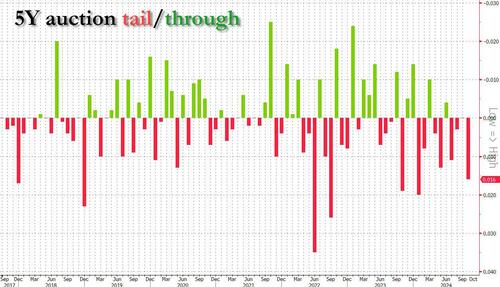 The high yield was 4.138%, up sharply from 3.519% in october and the highest since June. And with the When Issued trading at 4.122% at 1pm, the 5Y tailed 1.6bps, making this the 4th consecutive auction that has failed to stop through (last month was on the screws) and the second biggest tail of 2024, only January’s 2bps tail was bigger.