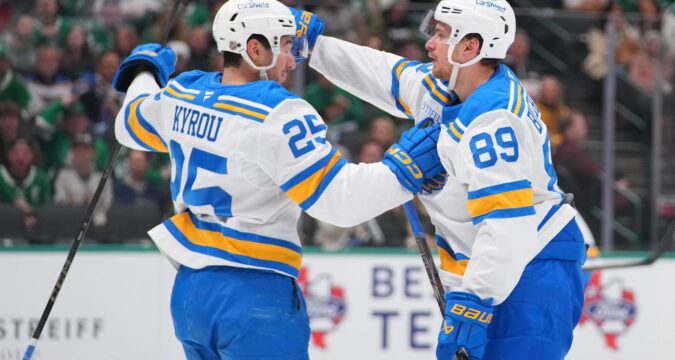 Neighbours tied it 1:34 later, and Kyrou gave St. Louis a 2-1 lead at 7:51. Neighbours (lower body) and Jordan Kyrou (upper body) were game-time decisions after early exits during Tuesday night against Dallas.