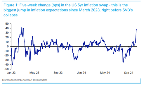 Then overnight, it was Deutsche Bank’s chief credit strategist Jim Reid who observed that US 5yr inflation swaps have seen their “largest 5-week climb since just before SVB’s collapse in March 2023, an event that shifted the narrative away from around 4 more hikes to imminent cuts for a period of time.”