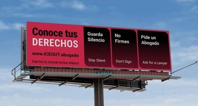 The billboard was funded by AvGeek Action Alliance, which is headed by Seth Miller, a state representative in New Hampshire. Miller is also an independent aviation journalist. He said the new billboard, which went up on Feb. 4 and will run through next month, is for immigrants to understand their rights and that “things aren’t necessarily as they have been presented to them by the government.”