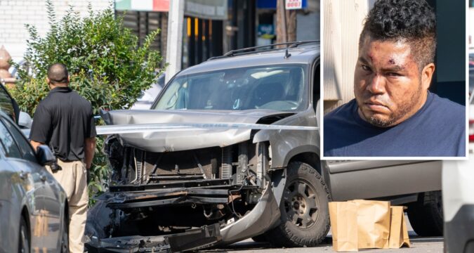 The suspect, who lives in Uniondale, L.I., according to cops, stayed at the scene for about 10 seconds, video shows, then sped off on the sidewalk but crashed into a parked car and was nabbed by responding officers.