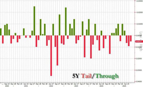 After yesterday’s stellar, blowout 2Y auction, moments ago the US sold $70 billion in 5Y paper in what was a far weaker auction.Â