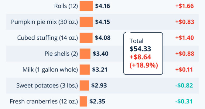 Each year the American Farm Bureau Federation releases a price survey of classic items found on the Thanksgiving dinner table. This year, the average cost of feasting stands at $54.33, which is less than last year but still constitutes a $8.64 increase from before the pandemic.