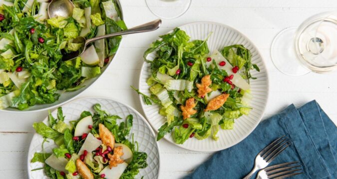 Place the arugula and romaine in a large serving bowl. Add the pears, Parmesan, and half of the pomegranate seeds to the bowl. Pour the dressing on the salad, and toss to combine. Scatter the remaining pomegranate seeds over the top, distribute the puff pastry croutons over the salad, and serve. You may also choose to serve the salads on individual plates, and then top with the remaining pomegranate seeds, and the croutons.