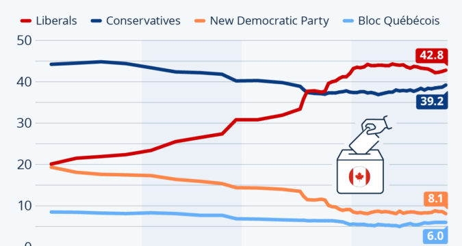 After Trudeau’s resignation, Liberal Party support surged from 20% to 43% under Mark Carney, and the Liberals are leading polls for the first time since 2022. Carney’s agenda focuses on economic growth, affordability, and global trade, including eliminating the carbon tax, ambitious housing plans, and infrastructure investment.
