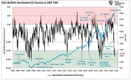 Market perspective is essential in avoiding investing mistakes. With the media constantly pushing a “Markets In Turmoil” narrative, it’s no wonder that investor sentiment recently reached some of the lowest levels since the financial crisis. The following chart is the z-score of the retail and professional investor sentiment composite index of bullish sentiment.