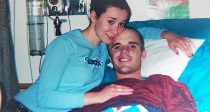 In this undated photo provided by Rachel Crowl, Nigel Max Edge, then known as Sean DeBevoise, lies in a hospital bed next to his wife, Rachel Crowl, in Tampa, Fla. (Rachel Crowl, via AP)