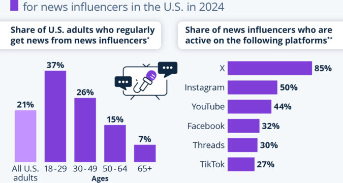 As Statista’s Felix Richter shows in the chart below, according to a Pew Research Center report commissioned by the Pew-Knight Initiative, 21 percent of U.S. adults regularly get news from news influencers, with young adults significantly more likely to do so than older ones.