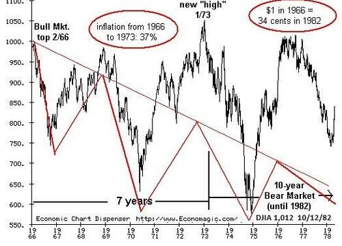 The 1970s stock market reveals how inflation works its magic: stocks noodle up and down for years, and everyone is relieved when the market returns to its previous highs: yea, we’re whole again! Well, no. Adjusted for inflation, “buy and hold” investors lost 2/3 of their capital. (Gamblers lost, too, and eventually gave up on minting money trading stocks.)