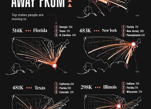 This visualization, via Visual Capitalist’s Kayla Zhu, shows the top five states that American residents moved away from in 2023 and their migration outflows, with the top three states where people from those states moved to labeled.