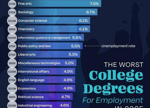 Fine arts and sociology follow closely, with unemployment rates of 7.0% and 6.7%, respectively. These degrees tend to offer mid-career salaries around $70,000, placing them on the lower end of the earnings spectrum.