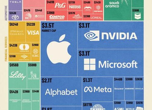 The world’s 50 largest companies collectively represent $34 trillion in market cap, with Technology leading the way at $19.3 trillion, followed by Healthcare at $3.8 trillion. Conglomerates like Berkshire Hathaway are not far behind, accounting for $1.5 trillion of the total market cap.