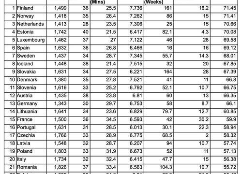 At the top of the ranking is Finland, with a total score of 71.45 out of 100. Finnish employees work an average of 1,499 hours per year, significantly less than countries such as Australia or the US, and are entitled to 36 days of paid leave. Family policies are especially generous: mothers can take up to 161 weeks of paid maternity leave while fathers are granted more than 16 weeks. People in Finland also spend about 15.2 hours each day on personal care and leisure, face an average commute of just over 25 minutes, and report a happiness score of 7.7 out of 10. Remote work opportunities are also strong, making Finland the clear leader.