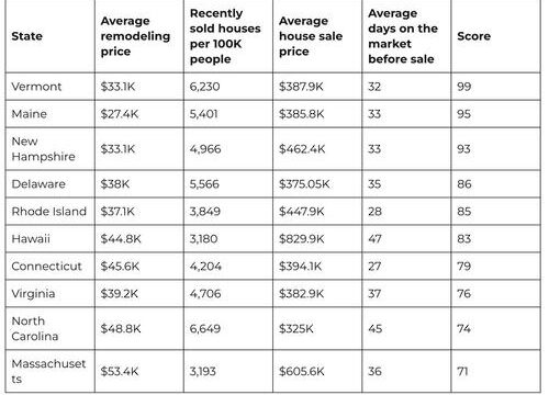 Vermont tops the list of best states for house flipping with a score of 99, thanks to fast sales (32 days on market) and high transaction volume. Maine follows with a score of 95, offering the lowest remodeling costs ($27,486) among top states and similarly quick sales, the study from Badeloft shows.