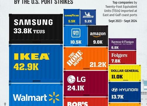 This graphic, via Visual Capitalist’s Dorothy Neufeld, shows the companies most exposed to the strike – the ones with the most twenty-foot equivalent units (TEUs) imported at East and Gulf coast ports over the past year – based on data from ImportGenius and Arbor Data Science shared by Liz Ann Sonders.