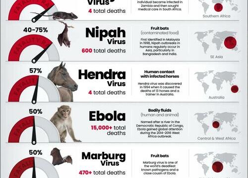 Most of the viruses ranked here originate in animals. Fruit bats are linked to Nipah and Marburg viruses, while rodents are associated with Lujo virus. Camels are the primary reservoir for MERS-CoV, first identified in Saudi Arabia in 2012.