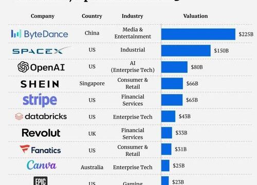 Australia’s only appearance is its graphic design company, Canva, which is worth $25 billion. Canva was founded in 2013 and is headquartered in Sydney.