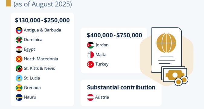 Both nations also have residence-by-investment schemes, a more common occurance in Europe and around the world, where investors are given (permanent) resident status first before later potentially having a path to citizenship. With more countries participating, price ranges for residence-by-investment are wider, while the program is not necessarily cheaper.