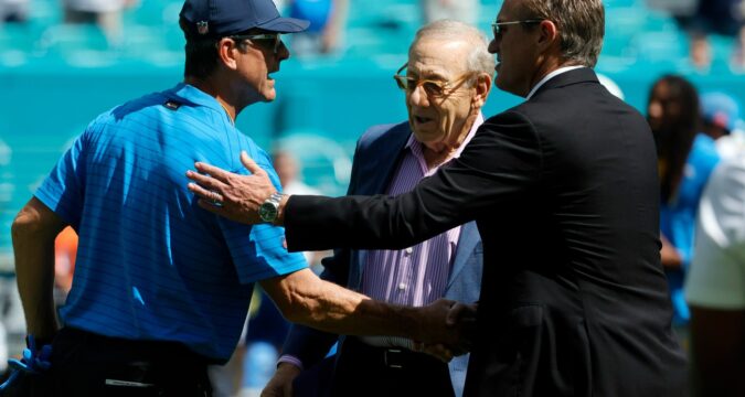 Dolphins owner Steve Ross walked solemnly off the field after the game. Ross was glimpsed on the sideline before the game, as usual. He was seen alongside team president Tom Garfinkel greeting Chargers coach Jim Harbaugh, Ross’ former target to be Dolphins coach as well as former national championship coach of Ross’ beloved alma mater, Michigan. Ross was on the field before the game as part of the Dolphins’ Crucial Catch campaign for cancer prevention. It’s unclear what Ross is thinking regarding McDaniel’s future. A few weeks ago he expressed a desire to be patient with McDaniel.