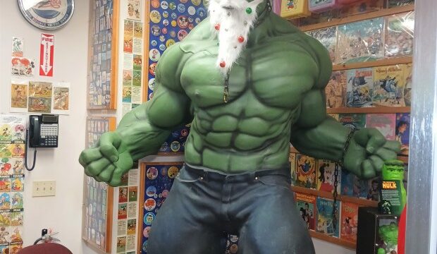 There are board games, some still in their cellophane wrapping, based on television shows like “Man from U.N.C.L.E.” and Barbie. Lunchboxes of every description hang neatly from the rafters of the first-floor display room, and movie props, like a full size Hulk with a lighted Christmas beard, stand in a corner.