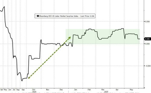 Following April’s weak ADP print (lowest job additions since July 2024), analysts expected a rebound in May from the “unease” before Trump paused the Liberation Day tariffs. Jobless claims, among others, have all supported signals that the labor market refuses to fold to soft data’s squeamishness over Trump’s policies…