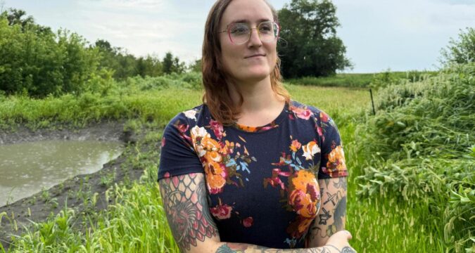 LeAnne Withrow, a transgender federal worker who has filed a class action lawsuit challenging a Trump administration policy prohibiting transgender federal employees from using restrooms aligned with their gender, poses for a photo at her home outside Springfield, Ill., July 30, 2025. (AP Photo/Claire Savage)