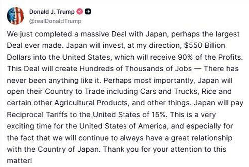 President Donald Trump announced on Truth Social that he reached a “massive” trade deal with Japan that will set tariffs on Japanese imports at 15% and see the key American trading counterpart and ally invest $550 billion into the US (with about the same likelihood of doing so as Stargate is to invest $500 billion in US AI technology) .