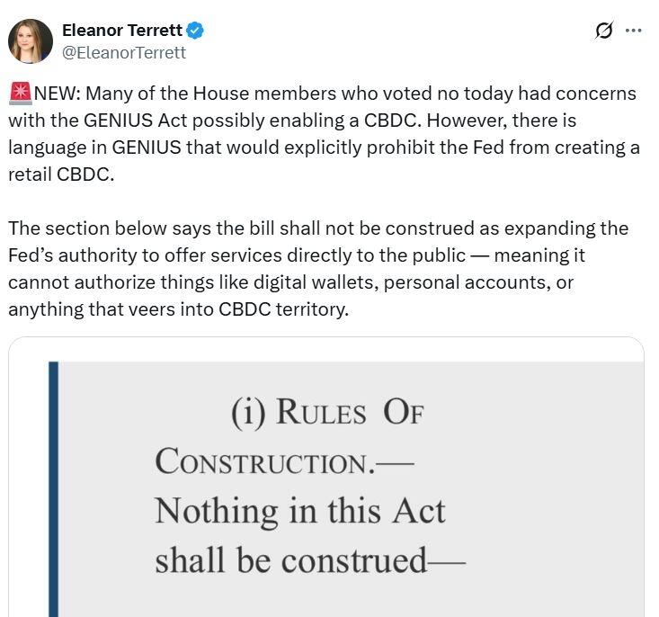 Meanwhile, Eleanor Terrett, the host of the Crypto in America podcast, said the GENIUS Act already prohibits the Fed from creating a retail CBDC.
