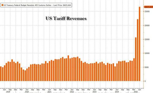 The deal comes just days after we learned that in June the US collected a new record in tariff revenue, some $26.6 billion: a number which annualizes to an impressive $320 billion.