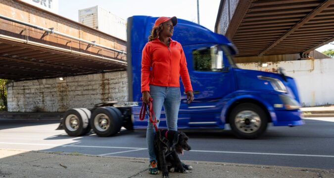 Alicia Frizzle walks with her dog, Lyra, along a designated truck route by West 59th Street, Sept. 8, 2025, in the Englewood neighborhood of Chicago. (Brian Cassella/Chicago Tribune)