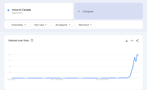 Google searches for “Move to Canada” surged overnight, almost in parallel with Trump’s rising election odds, as the historic election swung key battleground states in his favor. Internet searches related to leaving the country continued climbing in the early morning hours, predominantly from liberal-leaning states.