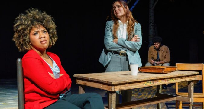 Lane’s production for Valencia captures the fairytale feel, with scenic designer Sydney Padgett’s towering birch trees and their yellow leaves providing a setting both bucolic and vaguely threatening. Sonia Pasqual’s aptly lighting helps turn the fairytale into a nightmare, as needed. Alex Abbott’s sound design — from the din of a college dorm to the blowing wind and chattering voices on the edge of hearing in a mysterious woods — enhances the mood.