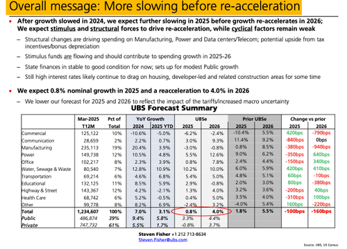 According to UBS analysts Steven Fisher, Amit Mehrotra, and others, the latest industry outlook for construction spending is expected to remain soft through 2025, with nominal growth projected at just .8%, while real growth is anticipated to decline by 3%. The weakness is primarily attributable to a slowdown in manufacturing project starts over the past year, as well as continued headwinds facing commercial projects across retail, office, and warehousing.