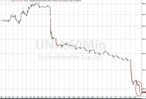 UNH shares are plunging after hours (down 6% and back below $300 for the first time since September 2020) following a report from The Wall Street Journal that, according to people familiar with the matter, the DOJ is investigating UnitedHealth Group for possible criminal Medicare fraud related to its Medicare Advantage business.