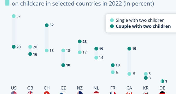 As Statista’s Katharina Buchholz details below, according to 2022 data from the OECD, U.S. couples who both earn average wage in full-time jobs and have two young children need to spend 20 percent of their disposable household income on childcare.
