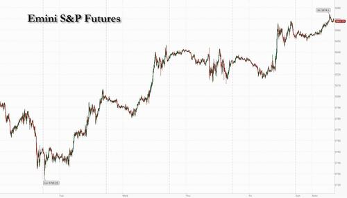 US bonds may be closed for the Columbus Day holiday, but stocks are open and merrily melting up on pace for their 46th record high of 2024. As of 8:00am, S&P futures are higher by around 0.2% and trading above Friday’s all time high while Nasdaq 100 futs rise 0.2% with NVDA, AAPL, and GOOG leading in MegaCap Tech as investors gear up for the latest round of corporate earnings and turn increasingly turn their focus toward the US election where a pro-market Trump victory looks more likely by the day. In China, the CSI 300 Index closer ~2% higher after a choppy session where markets pumped, then dumped, then rebounded once the National Team stepped in as traders digested the latest disappointing pledges from Beijing over the weekend to support the economy. Europe’s Estoxx 50 is flat. US cash bond markets are closed today; the Bloomberg Dollar index is higher. Commodities are mixed: oil prices are -2.3% lower, base metals are higher, and precious metals show mixed movements. This week, we will have a busy earnings calendar, along with Retail Sales release on Thursday.