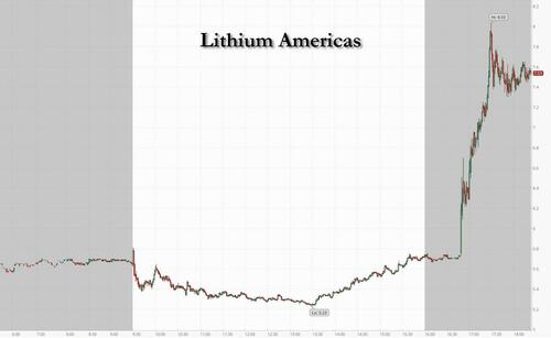 One week after Bloomberg reported that the White House was considering a 10% stake in one of the largest North American lithium mining companies, Lithium Americas, on Tuesday afternoon, the US government agreed to acquire a stake in the company, Secretary of Energy Chris Wright said Tuesday on Bloomberg TV, giving a boost to the Canadian company as it develops its Thacker Pass lithium project in Nevada.