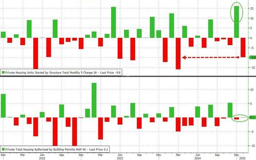 After December’s unexpected huge upside surprise (+15.8% MoM), analysts expected housing starts to tumble back to earth in January as the lagged impact of higher rates unsettles homebuilders ‘goldilocks’ reality dream. Sure enough, Starts plunged 9.8% MoM (worse than the 7.3% decline expected), while permits rose a skimpy 0.1% MoM (better than the -1.5% exp)…