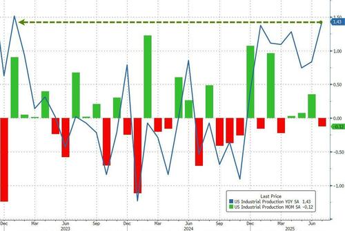 US Industrial Production dipped 0.1% MoM in July, but thanks to an upwardly revised 0.4% MoM rise in June, the YoY rise in Industrial Production was +1.43% – the biggest YoY jump since Jan 2023…