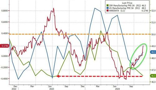 Minutes after the BLS reported the biggest drop in manufacturing jobs since the COVID lockdowns, S&P Global reported its US Manufacturing PMI rose to 48.5 in October (still in contraction) from 47.3 in September (as ‘hard data’ has exploded higher this month. ISM’s Manufacturing PMI was worse than expected, dropping from 47.2 to 46.5 in October – the lowest since June 2023…