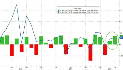 New home sales soared 7.4% MoM in March (dramatically better than the +1.3% MoM expected), lifting sales up 6.0% YoY…
