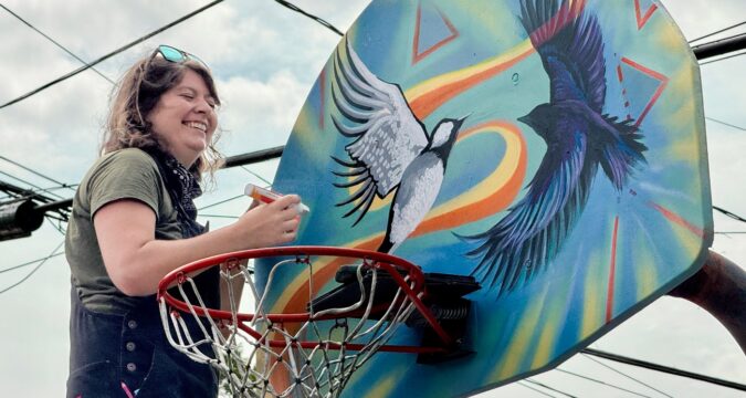 Muralist Kian Dubay, of Pittsburgh, traveling with fellow artist Phil Seth, beautified a dingy basketball goal north of the Valparaiso Creates Center on Indiana Avenue. The two birds she painted are symbolic. “It’s kind of like my sister and me joining our families,” she said.